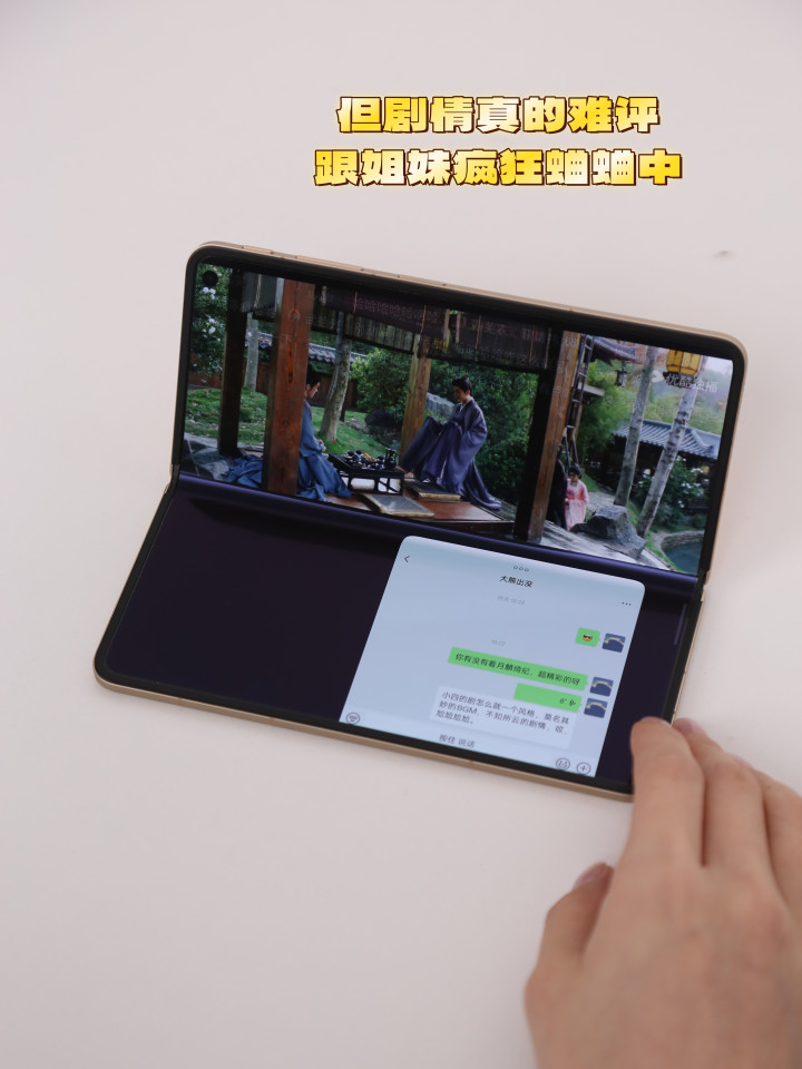 平时干饭的时候更方便,直接把它折一半“悬停”放在桌子上,上半边屏幕播剧,下半边屏幕还能继续挂着小窗回消息,绝对的干饭追剧神器。🍚